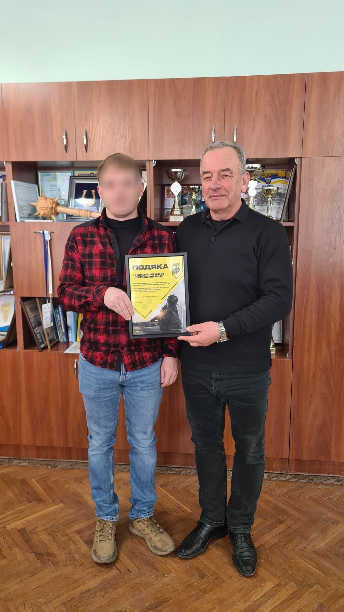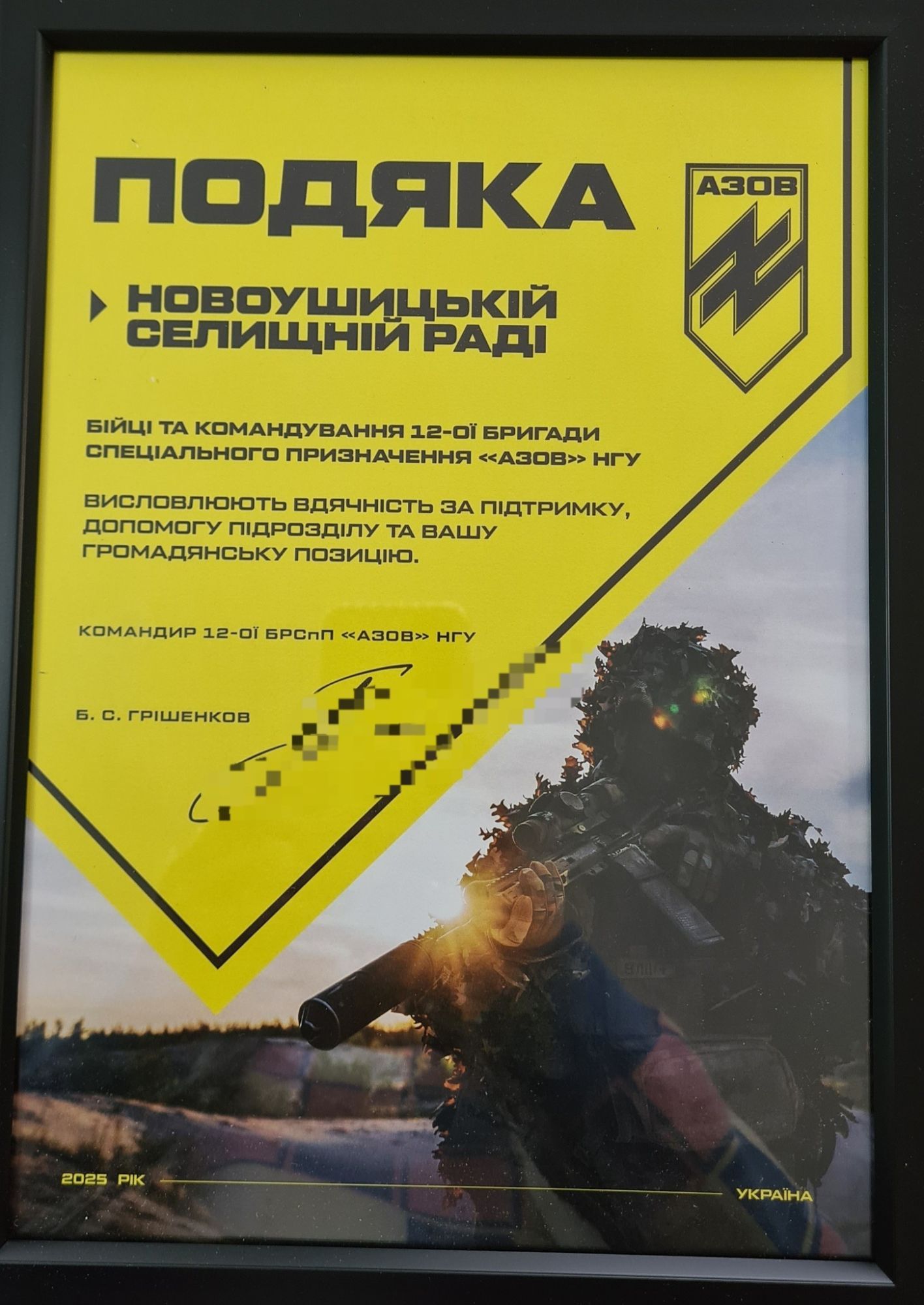 Захисник передав селищному голові подяку бійців та командування 12-ї бригади спеціального призначення “АЗОВ” НГУ за підтримку та допомогу підрозділу.