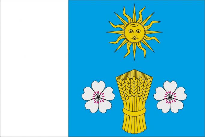 On an azure field is a wheat sheaf Argent, above which is a sixteen-rayed sun with a human face, and on the sides - one apple blossom of natural colour.