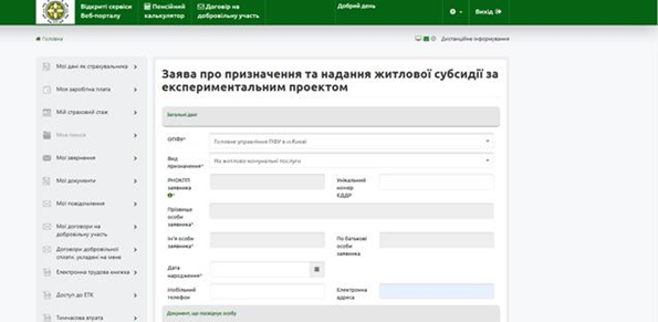 2. В особистому кабінеті на панелі зліва в розділі “Комунікації з ПФУ“ обираємо опцію “Заява на житлову субсидію чи пільгу“.3. У спливаючому вікні натискаємо кнопку “Продовжити”.4. У наступному вікні обираємо опцію “Заява про призначення та надання житлової субсидії за експериментальним проектом”.5. Заповнюємо онлайн-форму заяви: вказуємо загальну інформацію про особу, яка подає заяву (в т.ч. паспортні та адресні дані), зазначаємо реквізити банківського рахунку (у форматі ІВАN), додаємо інформацію про членів домогосподарства.