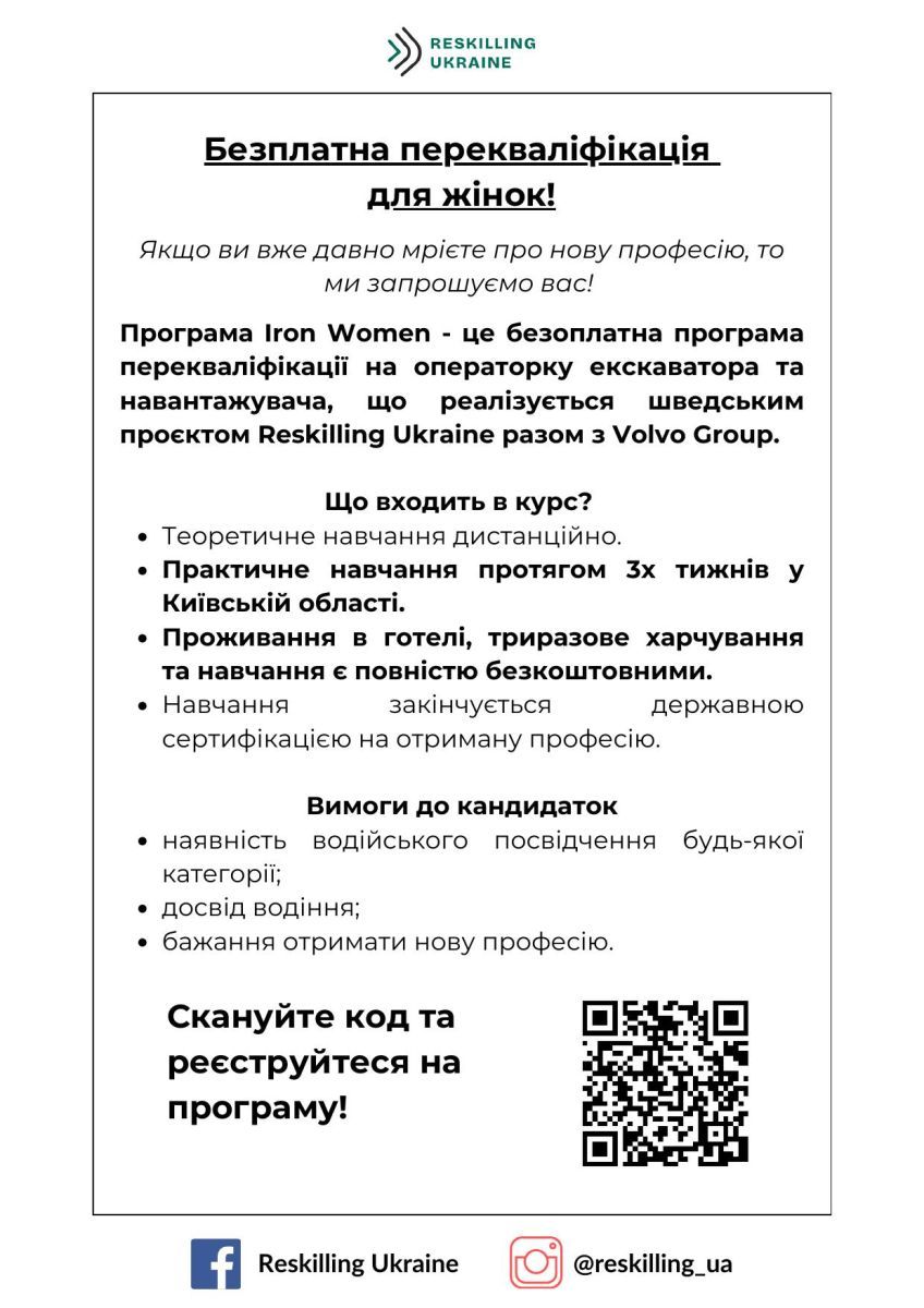 Проєкт Reskilling Ukraine запрошує українських жінок долучитися до спеціалізованої програми перекваліфікації, яка надає можливість розвинути нові кар’єрні перспективи в будівельній та видобувній галузях. У рамках програми передбачено підготовку за професіями машиністки екскаватора та водійки фронтального навантажувача з особливим акцентом на практичне оволодіння сучасною технікою.