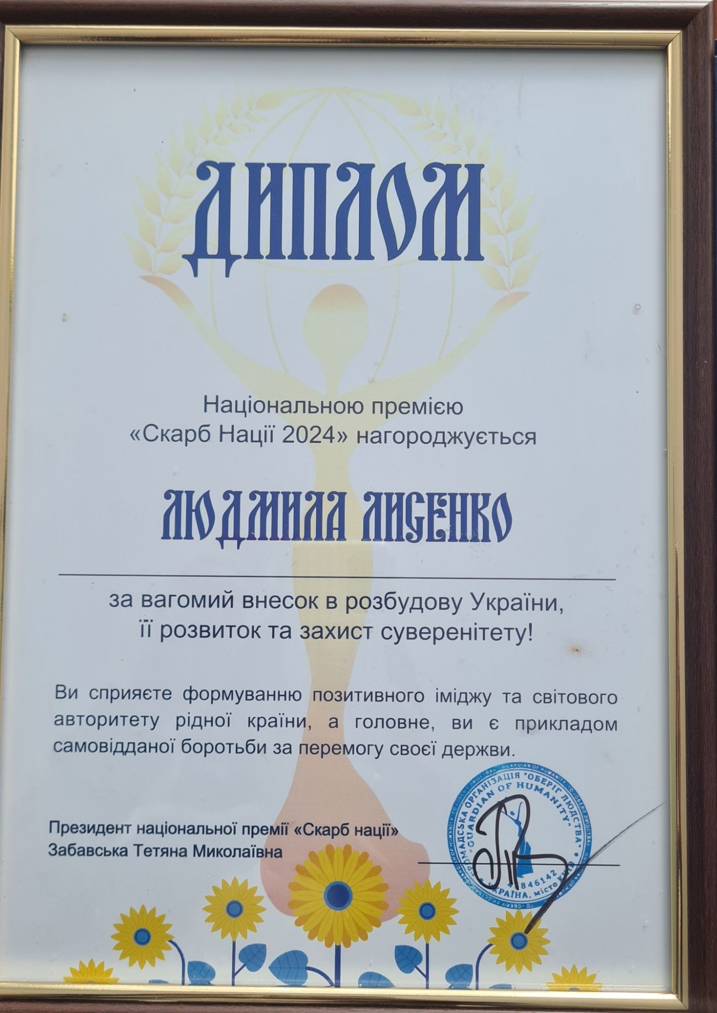 Цього разу в селищну раду Людмила Лисенко прийшла поділитися своєю радістю - вона одержала національну премію “Скарб Нації 2024”. Цією почесною нагородою відзначають за вагомий внесок в розбудову України, її розвиток та захист суверенітету.