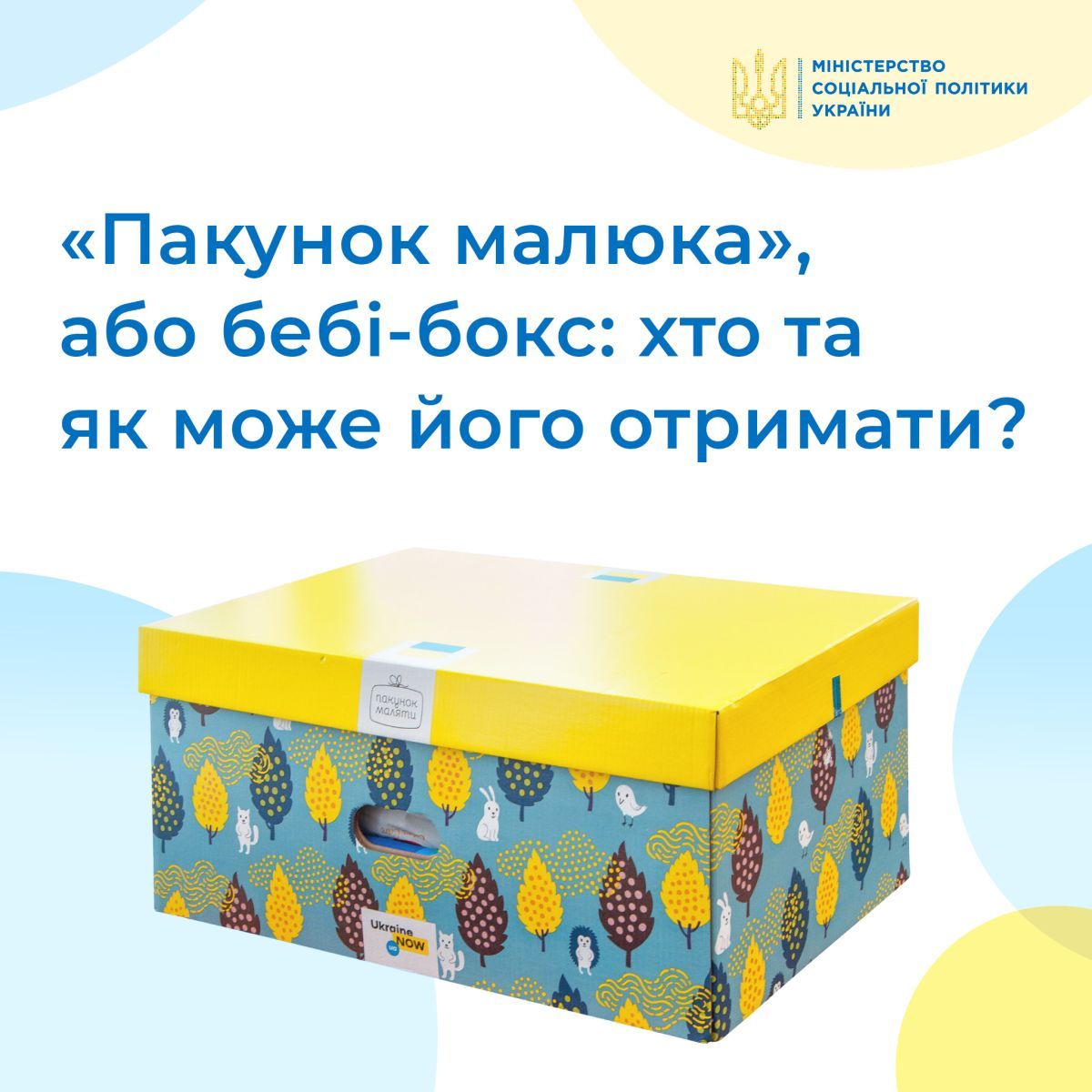 Кожна сімʼя, у якої народилася дитина, може отримати допомогу від держави у вигляді «пакунка малюка» (бебі-бокс). У ньому міститься комплект із понад 90 предметів і виробів, які знадобляться для догляду за немовлям у перші місяці його життя (підгузки, пеленки, ковдри, засоби гігієни, іграшки та інше). Усі речі обов’язково перевірені та сертифіковані. Загальна вартість такого пакунка – 6 778 грн.