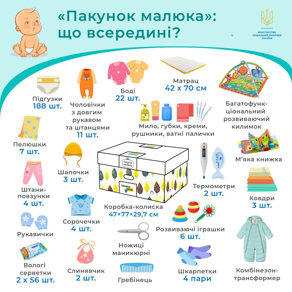 В інфографіці нижче розповідаємо, що саме можна знайти в «пакунку малюка».